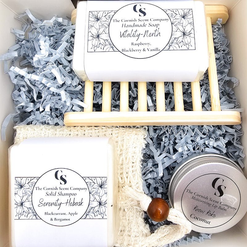 Elevate your self-care with The Cornish Scent Company's Cosmetics Essential Collection. Luxurious and eco-friendly, this thoughtfully curated set pampers and nourishes from head to toe. The star is our Large Moisturising Lip Balm, providing intense hydration and protection. The Cornish Soap Bar cleanses gently, leaving a captivating fragrance. Our Solid Shampoo, enriched with botanicals, promotes lustrous locks and reduces plastic waste. The Limited Edition Bamboo Soap Dish adds elegance, while the Eco-Friendly Soap Saver Pouch extends soap life with gentle exfoliation. Embrace Cornwall's beauty and sustainable self-care. Order now for an enchanting and nurturing beauty routine that makes a positive impact on the planet.